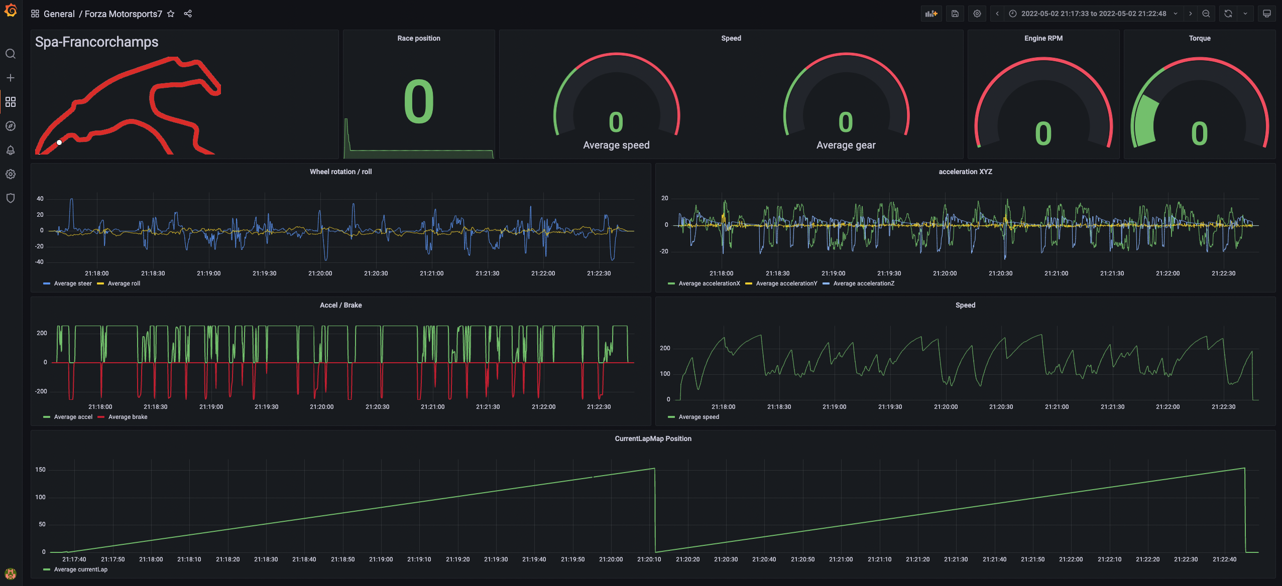이후 그라파나를 통해 엘라스틱서치에 forza-kafka라는 이름으로 인덱스를 조회하면 레이싱 데이터를 실시간으로 그라파나에서 조회할 수 있습니다.