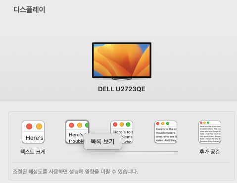맥 벤투라에서 디스플레이 옵션에서 확장된 해상도를 확인하기 위해서는 5개 디스플레이 옵션 위에서 마우스 우클릭을 하여 '목록 보기'를 클릭하면 됩니다.