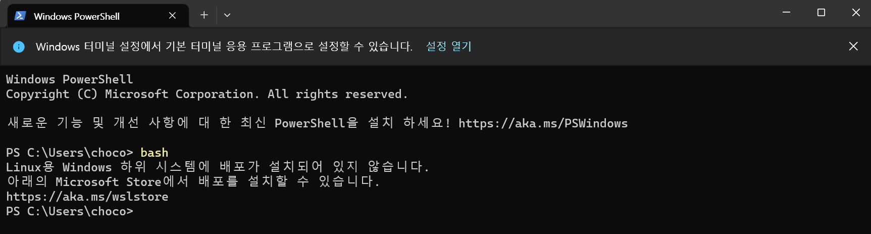 이후에 터미널을 실행시키고 명령어를 실행할 때는 Bash 명령을 사용할 수 있습니다.