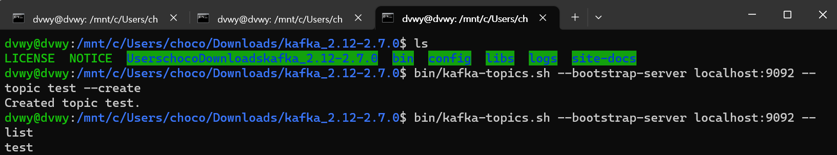 $ bin/kafka-topics.sh --bootstrap-server localhost:9092 --topic test --create