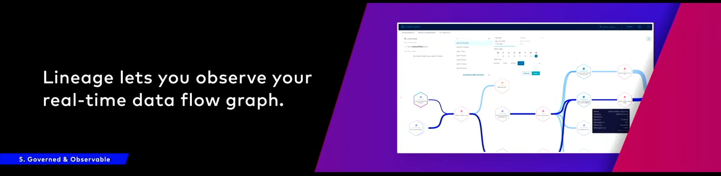 사실 이건 모든 데이터에서 중요함. 하지만 스트리밍에서는 이를 잘 다루어야함. 배치에서는 사실 다루기 쉬웠음. 되거나/안되거나 둘중 하나였고 실제로 안되었다면 다시 실행하면 되었기 때문임. 스트리밍은 배치와 다르게 투명하게 운영해야만 하며 이를 놓쳐서는 안됨. 또한 데이터를 사용할 때는 여러 법적인 측면도 잘 다루어야 하기 대문에 이 데이터가 어떻게 운영되고 있는지, 어떤 원천 데이터를 활용하고 있는지 파악이 되어야만함. 이를 위해 confluent에서는 Catalog, Schema, Lineage를 지원하고 있음