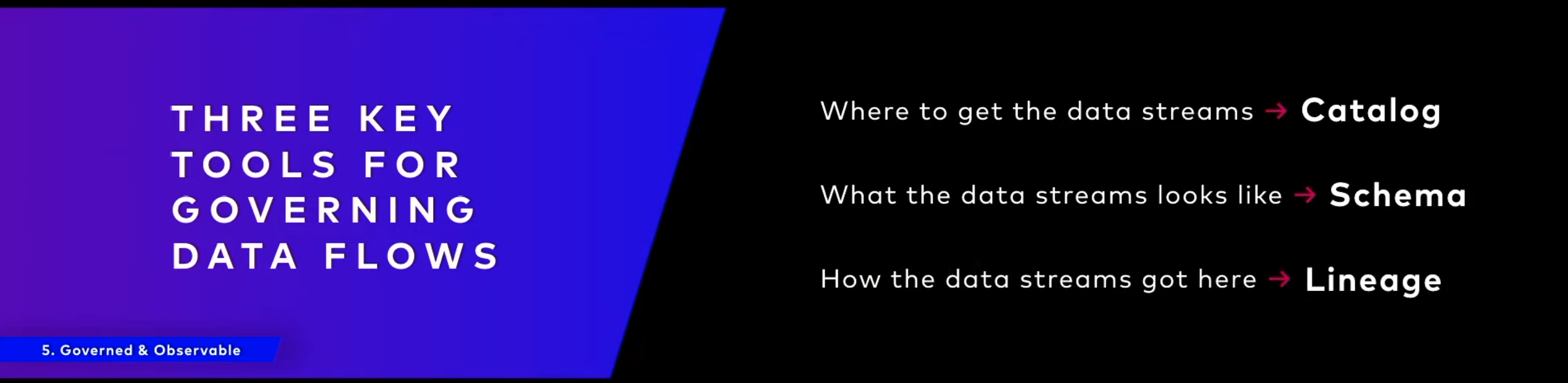 사실 이건 모든 데이터에서 중요함. 하지만 스트리밍에서는 이를 잘 다루어야함. 배치에서는 사실 다루기 쉬웠음. 되거나/안되거나 둘중 하나였고 실제로 안되었다면 다시 실행하면 되었기 때문임. 스트리밍은 배치와 다르게 투명하게 운영해야만 하며 이를 놓쳐서는 안됨. 또한 데이터를 사용할 때는 여러 법적인 측면도 잘 다루어야 하기 대문에 이 데이터가 어떻게 운영되고 있는지, 어떤 원천 데이터를 활용하고 있는지 파악이 되어야만함. 이를 위해 confluent에서는 Catalog, Schema, Lineage를 지원하고 있음