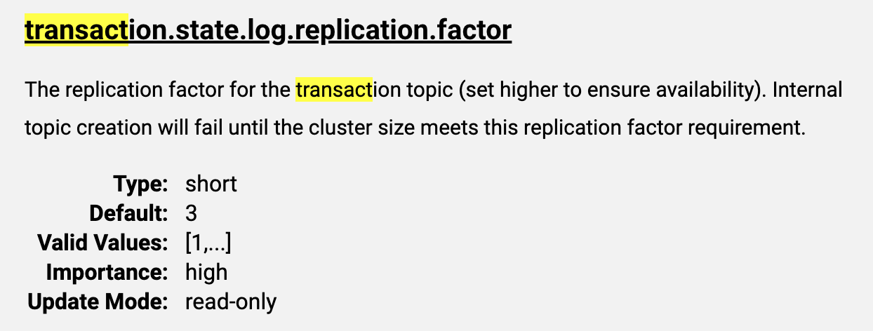 이게 기본값이 3이라서 그런데, 로컬에서 브로커1개로 띄웠을때는 3개 rf로 만들 수 없기 때문에 무한반복 나는 것 ㅜㅜ