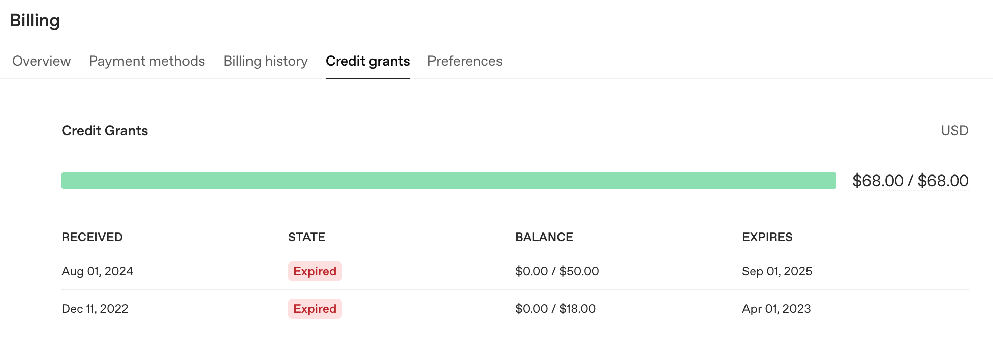 그래서 내가 이걸 어디 낭비해서 다썻나..? 하고 payment history 내역을 찾아봐도 아무리 쓴 내역이 없다. 그러다가 들어간 곳은 credit grants. 여기서 수상한 state를 볼 수 있었는데 EXPIRE 라는 글자가 있는게 아닌가;