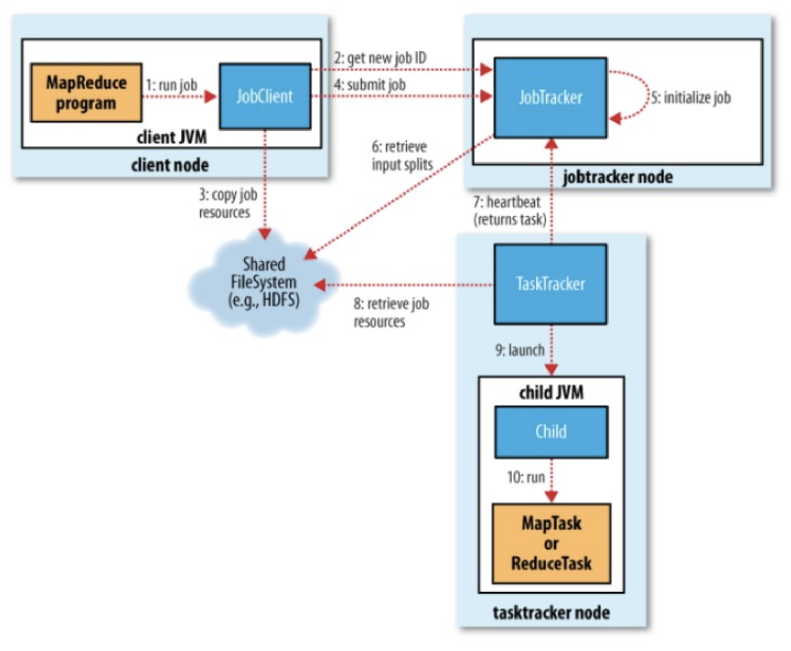 Tasktracker : 태스크를 수행하고 데이터 처리가 완료되면 Jobtracker에 결과를 보냄. 만약 태스크가 실패하면 Jobtracker가 다른 Tasktracker를 통해 데이터를 처리함. TaskTracker는 hearbeat를 주기적으로 Jobtracker로 전송.